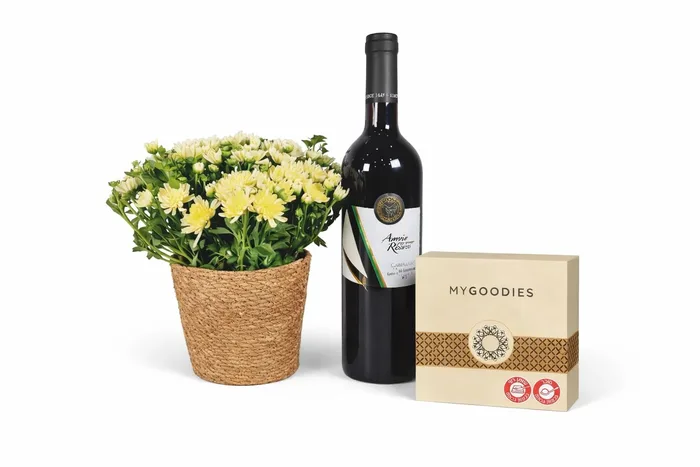 מארז עציץ חרצית בסלסלת קש