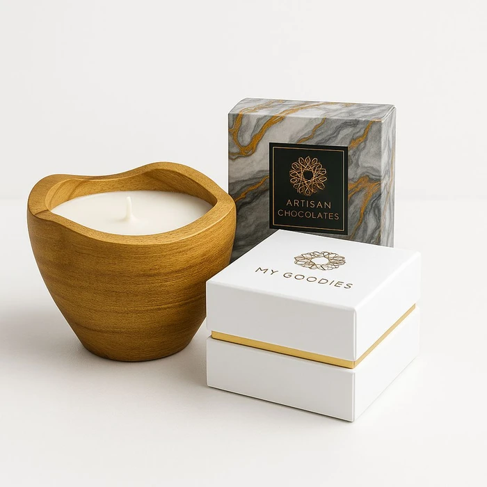 מארז יוקרתי ומעוצב בקפידה הכולל : נר גדול דקורטיבי עשוי עץ מלא ושני אריזות פרלינים יוקרתיות מבית MY GOODIES המארז כשר בד"ץ