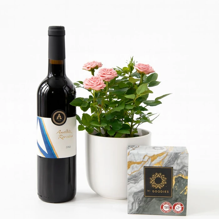 מארז עציץ ורדים עם יין ושוקולד יוקרתי