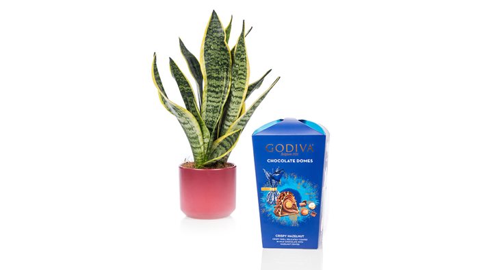 מארז עציץ סנסיורייה מגוונת עם כלי קרמי מותאם ושוקולד גודייבה