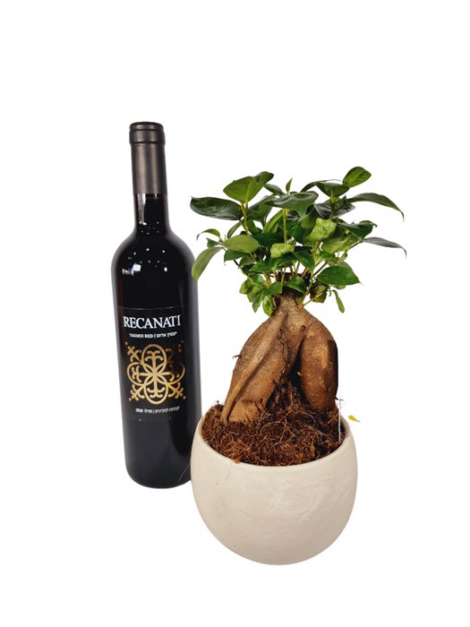 בונסאי פיקוס בכלי פסיפס עם בקבוק יין מהודר