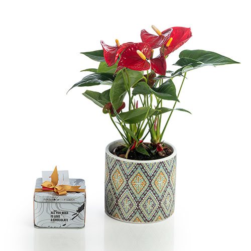 מארז עציץ אנטוריום בכלי מרוקו עם שוקולד