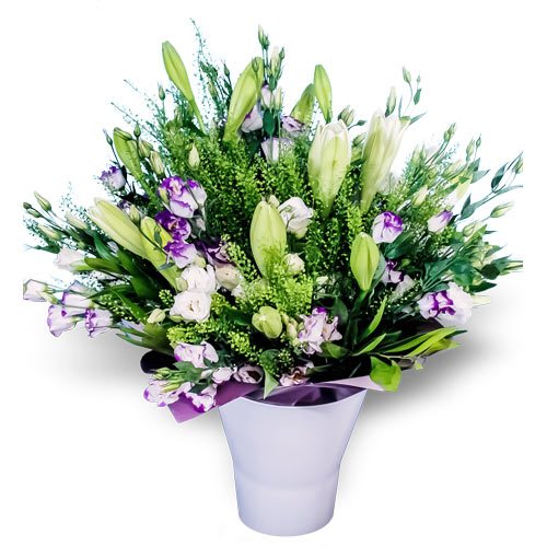 זר פרחים שזור בגוונים סגול ולבן,המכיל ליזיאנטוסים ושושן צחור, בשילוב אלמנטים ירוקים מעוצב בסגנון קלאסי אלגנטי.