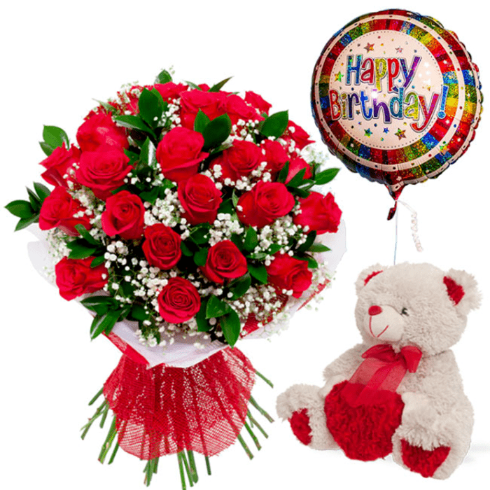 סט רומנטי המכיל זר ורדים אדומים, דובי ובלון הליום: קומבינציה המשלבת זר פרחים שזור מורדים בסגנון אלגנטי בתוספת בלון הליום, דובי.